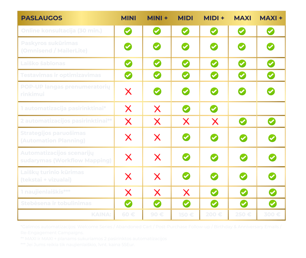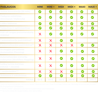Naujienlaiškiai – tai labai efektyvi ir draugiška biudžetui marketingo priemonė, kuria tiesiog būtina naudotis kiekvienam verslui. Naujienlaiškių pagalba galime didinti pardavimus, stiprinti klientų lojalumą, skatinti pakartotinius pirkimus bei kurti ilgalaikį ryšį su jūsų auditorija. Leiskite man pasirūpinti naujienlaiškių kūrimu, o jūs mėgaukitės jų rezultatais!